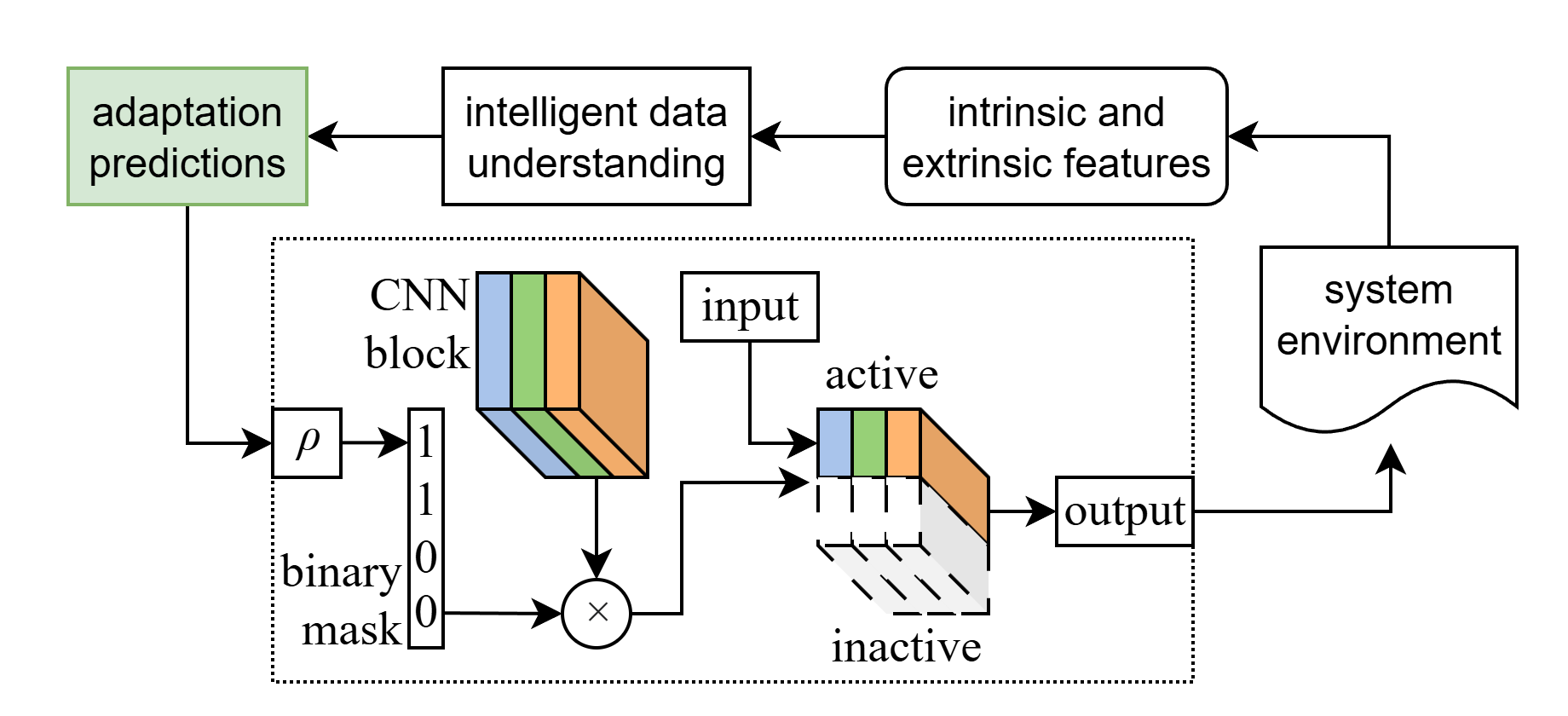Shown above is a pipeline in which an adaptive mechanism is integrated into a dynamic CNN block, enabling controlled scaling of the slimmable network.