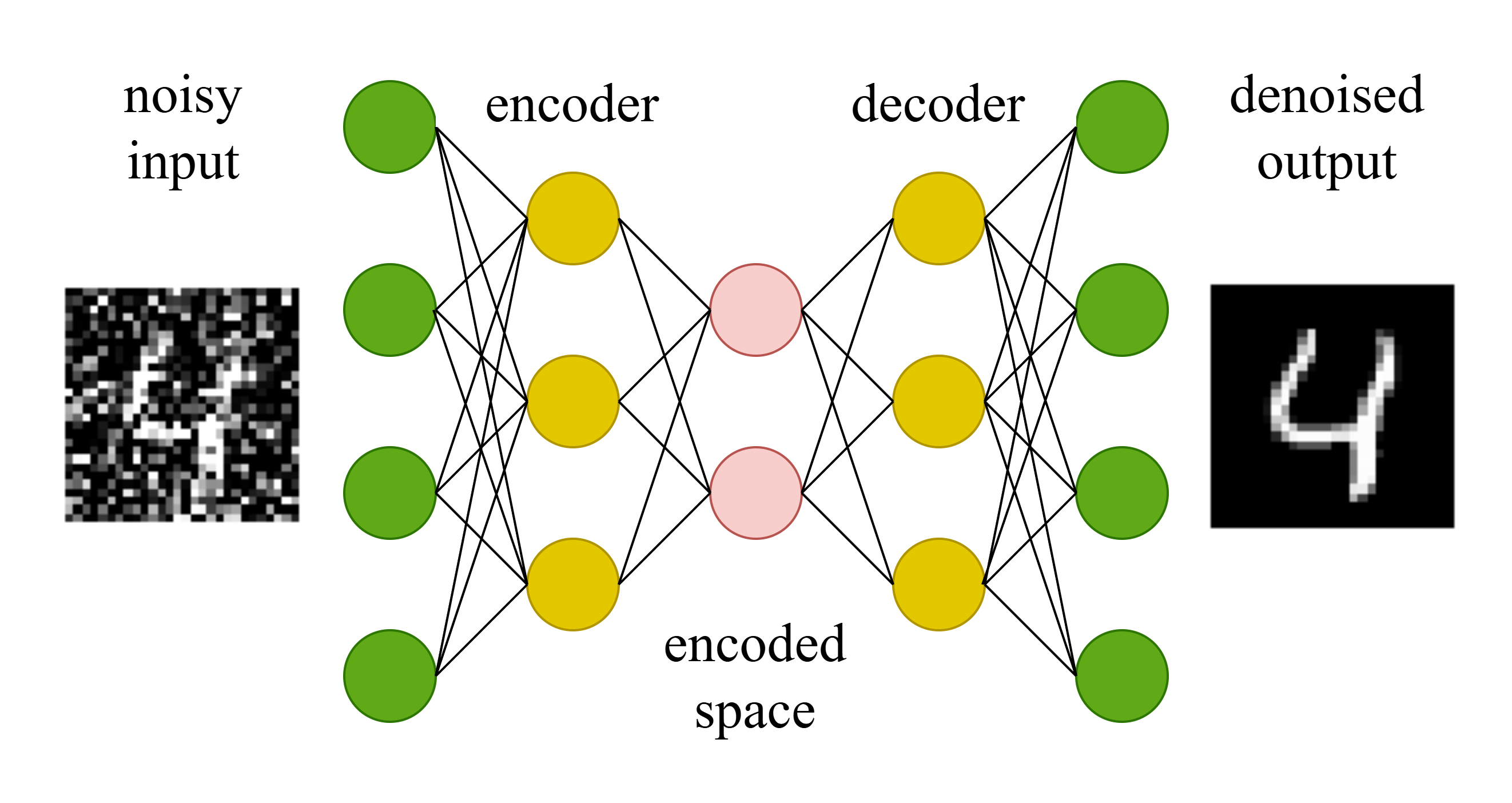 Shown here is a noisy image, from the MNIST dataset which contains hand-drawn numbers, input into a denoising autoencoder that denoises the image.