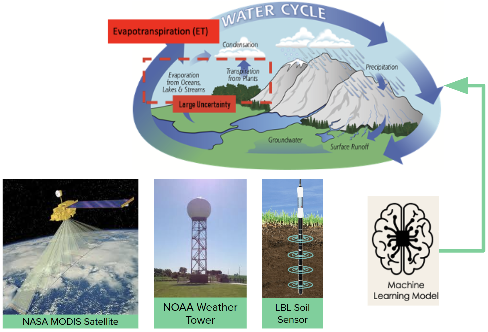 Another of my applications is in predicting Evapotranspiration (ET) from real-time satellite imagery, meteorological forcing data, weather towers, and field sensors. Existing approaches typically rely on interpolation methods followed by rigid physics-based calculations. In contrast, I develop flexible DNN frameworks capable of operating directly on noisy, incomplete data by integrating a DAE into the pipeline. These improvements have implications for agricultural monitoring and water-resource management. Further methods can be utilized to determine sensor placement, based on confidence levels and quantified uncertainty.
