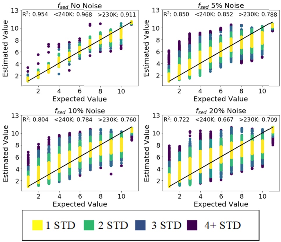 During the conceptual stages of satellite development, a topic of interest is in assessing whether given mission and instrument design parameters will provide data suitable for extracting quantities of interest. To this end, I developed stand-alone C++ neural network code that potentially helps speed observation and mission design planning, by training a neural network pipeline with the selected mission parameters and evaluating the downstream distribution of predictions. The figure shown here illustrates some results of how the noise resulting from selected parameters for a proposed satellite mission would affect the ability to detect the atmospheric cloud properties, , of exoplanets.