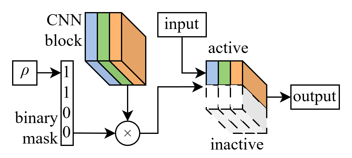 Shown above is a slimmable neural network dynamically activating a sub-network of active channels within a CNN block. Active channels are determined by the slimming factor, , set during a forward pass of a slimmable CNN. In this hypothetical example, and there are four maximum channels.