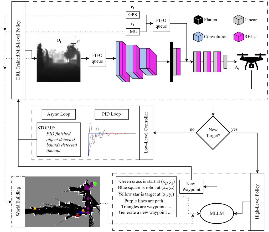 - Mid-Level Policy (Action Generation): Operating on-board, this tier generates motion commands (e.g., move left, rotate). It is driven by deep reinforcement learning (DRL), imitation learning, and rule based policies.
